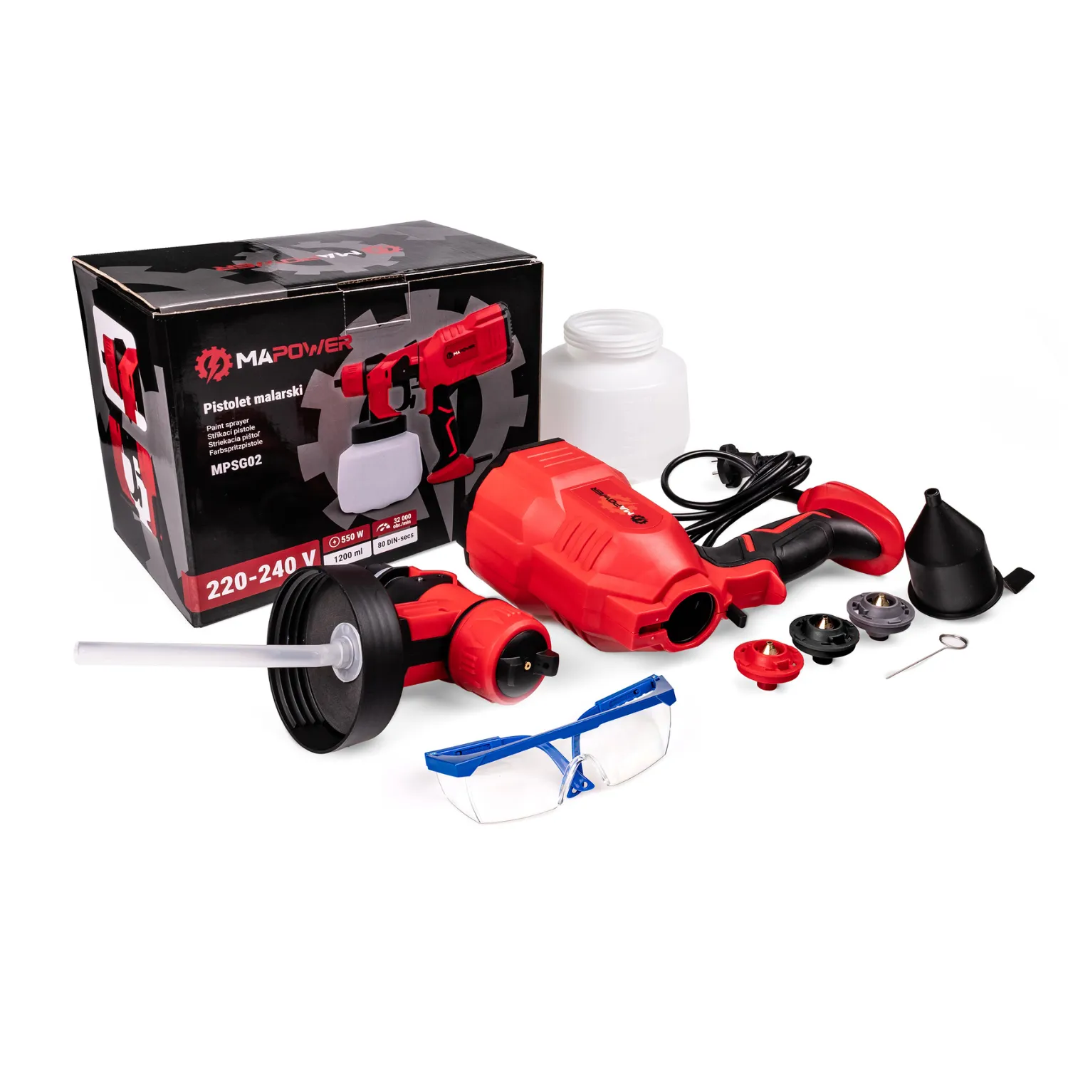 - Wyposażenie zestawu Pistolet do malowania MPSG02, wymienne dysze 3szt., lejek do pomiaru lepkości, okulary ochronne, maseczka jednorazowa, igła do czyszczenia, rękawiczki jednorazowe, instrukcja obsługi