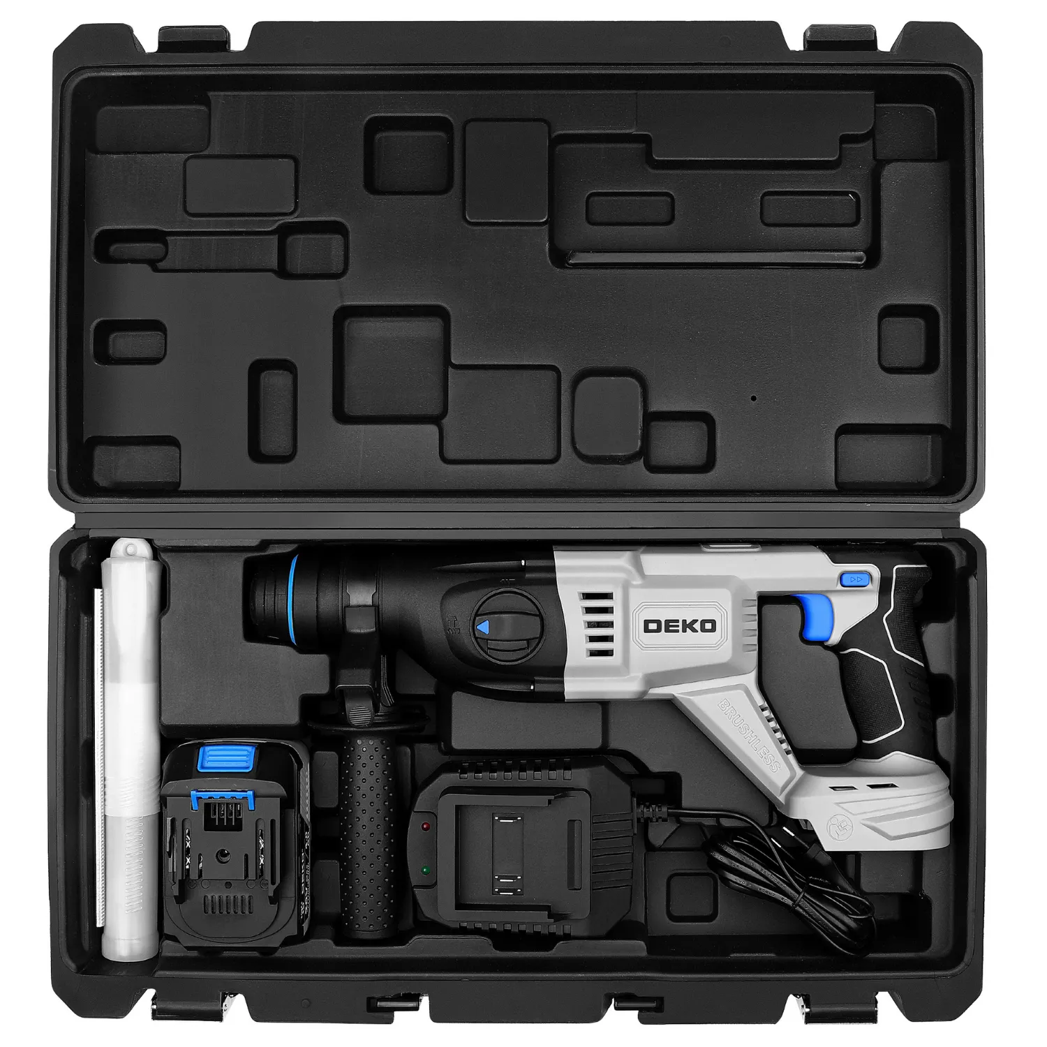 - Wyposażenie zestawu Młotowiertarka akumulatorowa DKBL20RH01-S1, akumulator, szpicak, 3 szt. wierteł 6/8/10 metalowy ogranicznik głębokości wiercenia, instrukcja obsługi