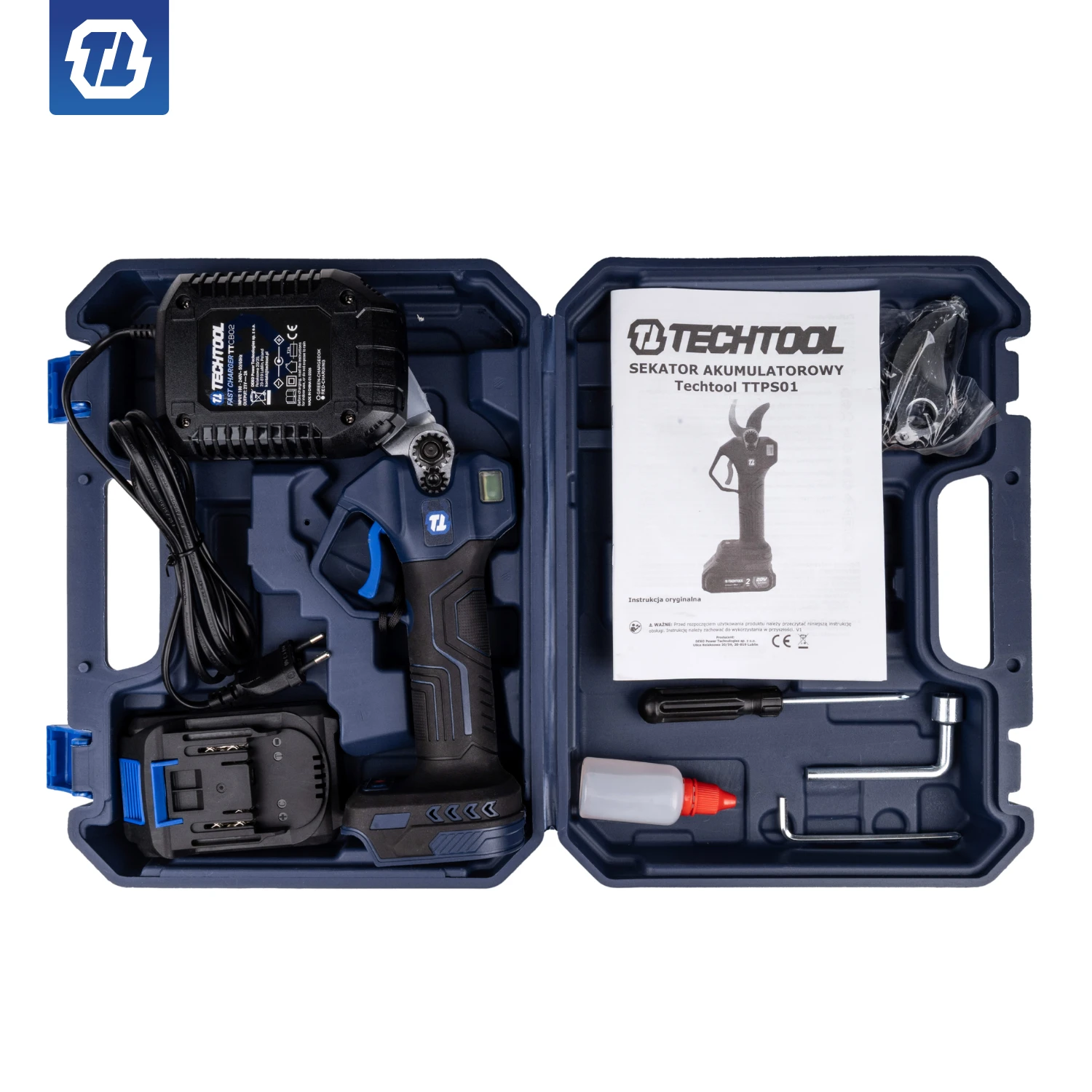 - Wyposażenie zestawu Sekator akumulatorowy TECHTOOL TTPS01, zapasowe ostrze i kowadełko, stacja ładująca, akumulator, olej do smarowania ostrzy, klucz imbusowy, śrubokręt, klucz nasadowy, instrukcja obsługi w języku polskim