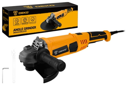 - Wyposażenie zestawu Szlifierka kątowa DEKO DKAG230LD20, uchwyt boczny, osłona tarczy, klucz do dokręcania tarczy, 2x szczotka węglowa, instrukcja obsługi