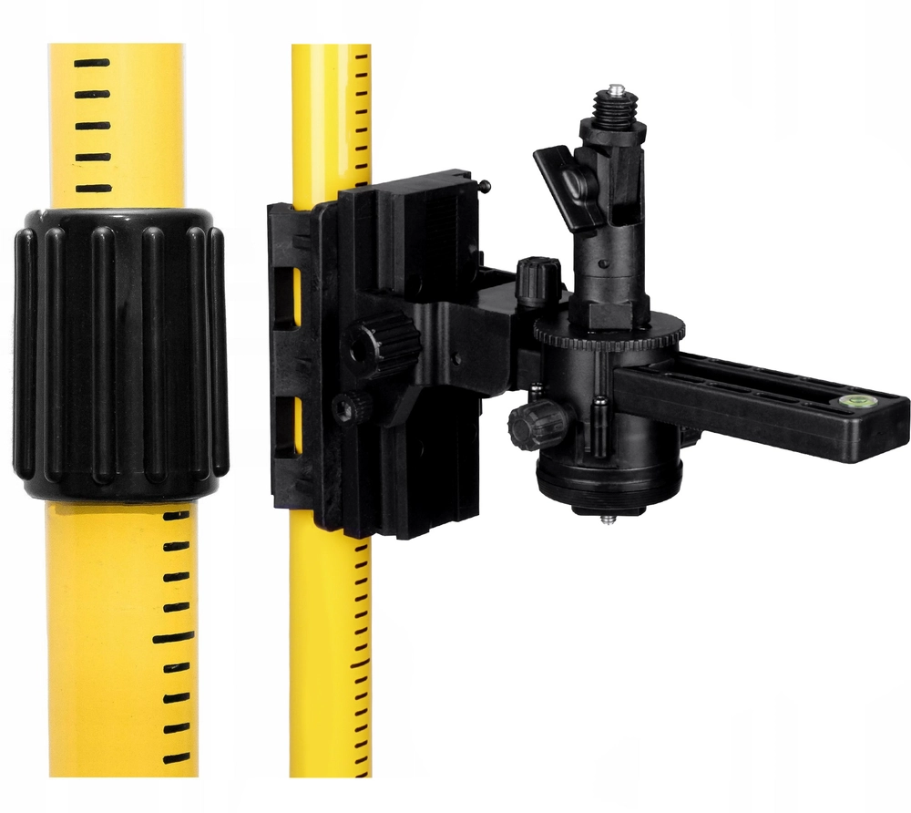 Tyczka jest wyposażona w uniwersalne mocowanie. Typ mocowania to standardowy gwint 1/4 cala, pasujący do większości urządzeń na rynku. W zestawie znajduje się również adapter 5/8 cala na 1/4 cala, który umożliwia montaż sprzętu z różnym rodzajem gwintu. Dodatkowo pozwala on na regulację kąta pomiędzy platformą a tyczką, co daje możliwość ustawienia poziomicy laserowej pod skosem – na przykład do wyznaczania linii ukośnej przy montażu schodów czy listew przypodłogowych.